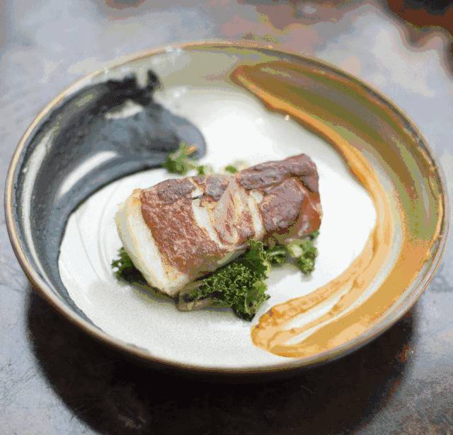 不过最特别是这道菜有两种炸酱,橘黄色是加泰罗尼亚烧烤酱 Romesco Sauce,黑色的则是墨鱼汁。君君更倾向于烧烤酱的味道,和煎烤鳕鱼更搭配。