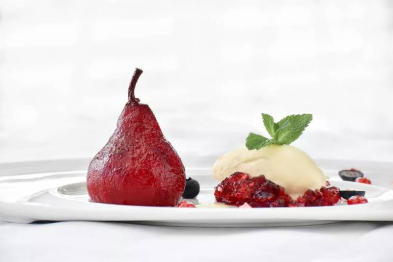 甜点是整个套餐的亮点,主厨特别炮制的红酒煮洋梨卖相、口味都好,其他精致的小配料包括了红酒味的小果冻、香草Gelato冰激凌等。完美地结束一餐!