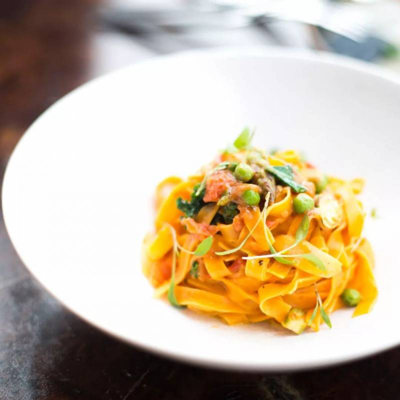 手工做的意大利宽面里加入了酸奶等主厨独家的配方,所以吃起来没有传统意大利面的厚实嚼劲,更多了些弹性。