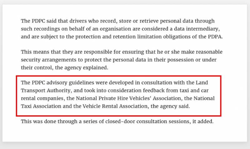 新加坡个人资料保护委员会指出,新加坡交通工具租赁业者安装车内摄录器材的情况很常见,用以阻吓对司机施暴或者逃付车资的乘客,但所采集的影像和声音有可能包括个人资料,因此受个人资料保护法令管制。