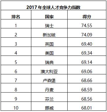 瑞士连续第二年获得全球人才竞争力指数排行榜的冠军。新加坡的排名与去年持平,但获得74.09分,比去年的71.456分更高。美国则从第三降至第四。