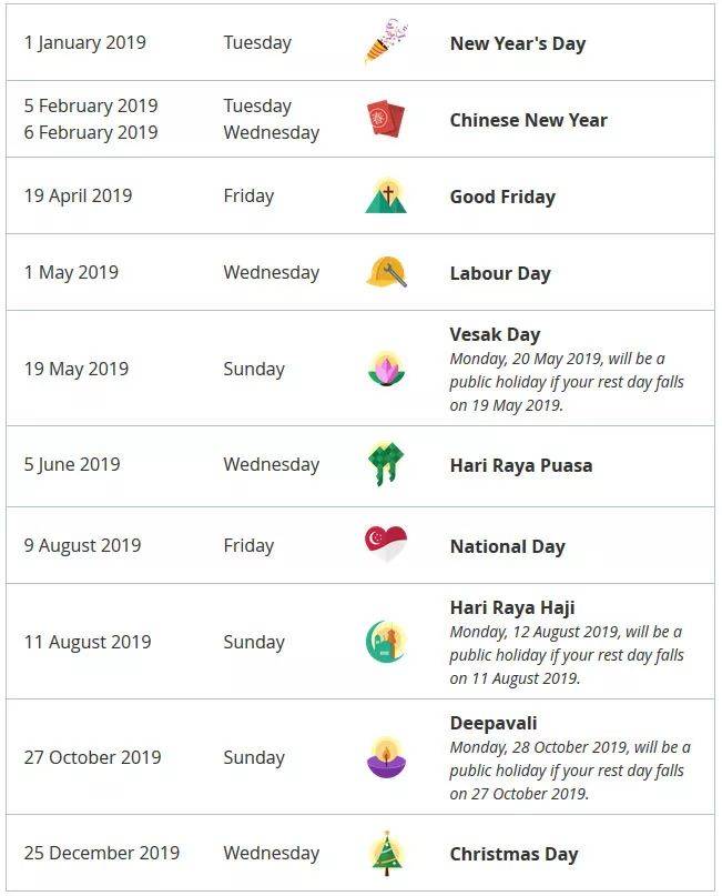 在2019年,有五个公共假期落在星期五或星期天。根据人力部的公告,落在星期天的公共假期,接着的星期一将会是公共假期。这意味着我们将有五个长周末。