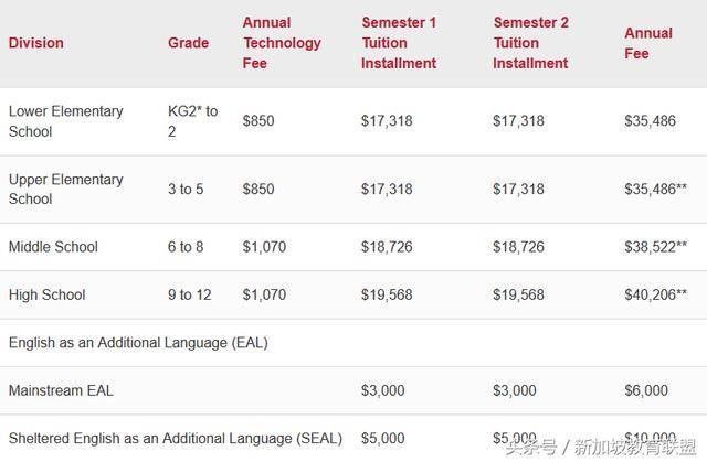 新加坡的国际学校众多,因为涵盖从幼儿园到高中,所以学费根据年级不同而有所区别,同时每个学校的学费也是不同,一般是从10000/年-40000/年不等,申请费也是在2000-4000之间。大家若是对哪个学校有兴趣,可以去相关学校的网站进行查询。立思辰留学360附上史丹福美国国际学校(SAIS Singapore)的学费表单,以资参考。