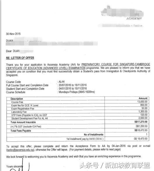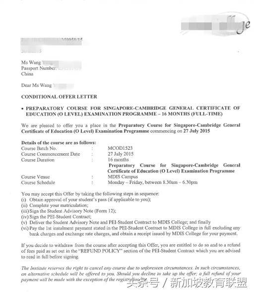 方案二:在高考二本左右的同学可以申请新加坡读O LEVEL,新加坡剑桥O水准考试(英文名Singapore-Cambridge General Certificate of Education Ordinary Level Examinations,简称GCE ‘O’ Level)是由新加坡教育部和英国剑桥大学考试局共同主办的统一考试。考试一年举办一次,考试成绩为英联邦各个国家所承认和接受,考试成绩两年有效。国内高中毕业的学生可以在新加坡读一年的O LEVEL后,去参加新加坡的O LEVEL考试,有机会考进新加坡的理工学院或者其他国家的大学预科。以下是申请O LEVEL王同学的offer