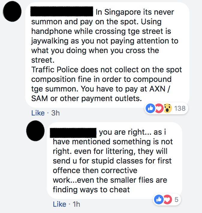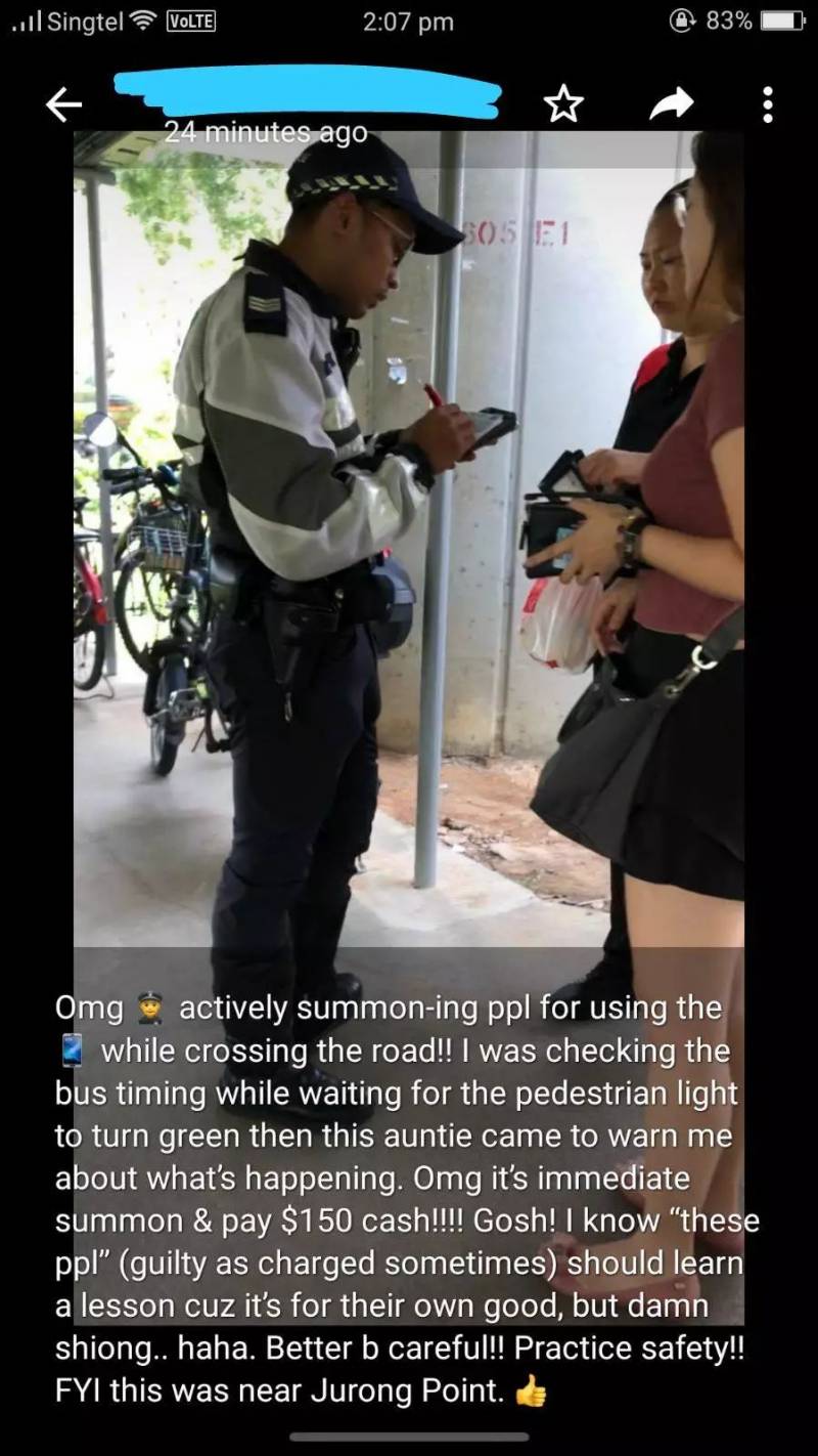 据发布者介绍说,在裕廊坊(Jurong point)附近看到有行人因为过马路的时候看手机,被交通警察拦下来,当场开罚单,罚款150新币!