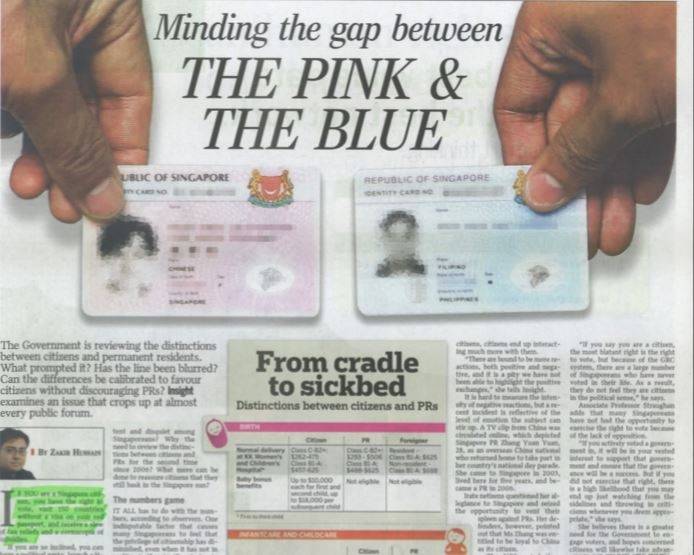 为了鼓励新加坡人生育子女, 政府给新加坡公民大笔的婴儿花红和税务回扣, 只要生一个就有现金拿, 生的越多, 拿的越多......, 连同税务回扣, 最高可达十多万元. 但对于PR, 养孩子要化同样的钱(甚至更高), 孩子长大也一样要当兵, 但却拿不到一分钱的婴儿花红和税务回扣....