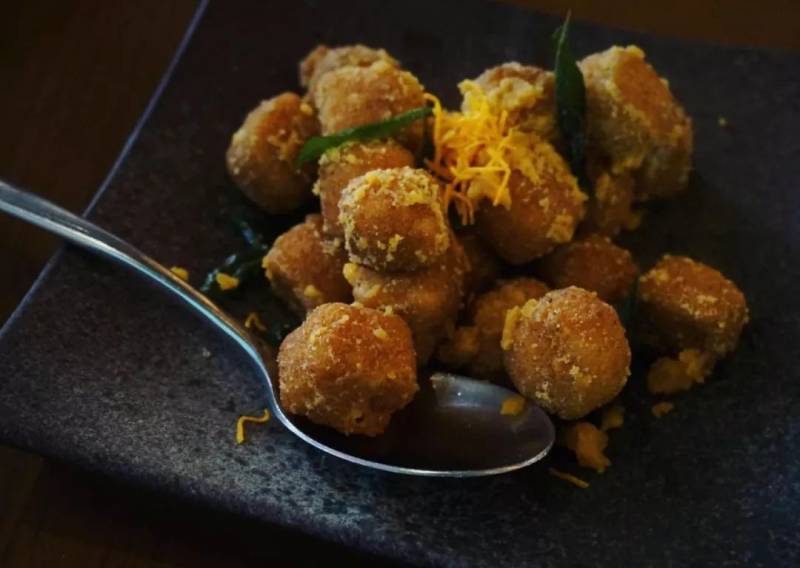 充分体现坡岛人对咸蛋黄的无限热爱。这个菜在菜单上是作为前菜,但我觉得足够作为主菜来提供。豆腐以圆球形巧妙地呈现出来,很有诚意,用咸蛋黄制成的辅料裹在豆腐表面上,再油炸,豆腐原有的豆香味在咸蛋黄的带动下更丰富而有层次,非常甘香酥脆,微辣,口感和坡坡网红薯片甚是相同。