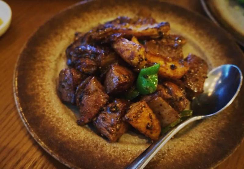 餐厅服务生大力推荐的菜式,必点菜之一。其实我的心不太踏实,总感觉吃过蒜片牛肉粒味道都差比多,没有多大不一样。 但夹起一块放进口里时,完全被打败了,被震撼到了。牛肉粒的肉质鲜嫩,体现在每一块牛肉粒的纹理细嫩无筋,散发着浓郁的牛肉香味,而且很大一块,配料是美式薯条和洋葱,用炒的方式,完全就是西式食材中式做法,大赞!!