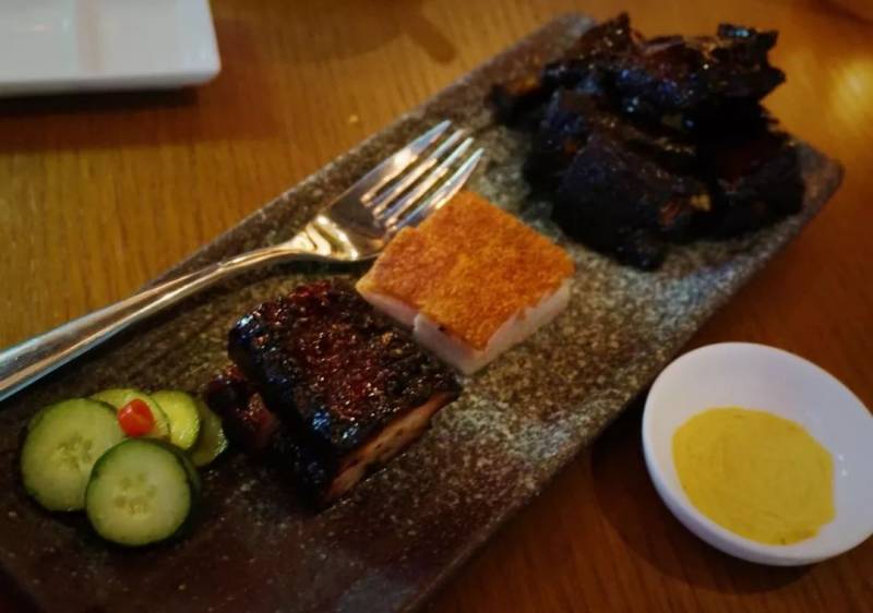 广式烧腊可以说是经典粤菜的代表,后来流传到香港,澳门等睇,进一步发扬光大。烧腊对于广州,就像拉面对于兰州,火锅对于四川的意义,它是广府人和港澳同胞最爱的传统美食之一。 此处三品分别是叉烧,烧肉,烧排骨。叉烧色泽红润鲜明,肉质软嫩多汁,三份肥七分瘦并且甜度也掌握得刚刚好,这样的叉烧吃上去口感最佳。 不过作为一个广州人,感觉叉烧没有多大惊喜,反而是烧肉和烧排骨,特别是烧肉,很正宗,皮非常焦脆柔嫩,肥瘦比列刚刚好,肥而不腻,正宗的粤式烧肉要的就是这个效果。 烧排骨加入新加坡做法,口感比较甜味道较浓,黑乎乎一块,总体来说还蛮得期待。 不过这个菜分量较少,除了三拼。也可以分开点。