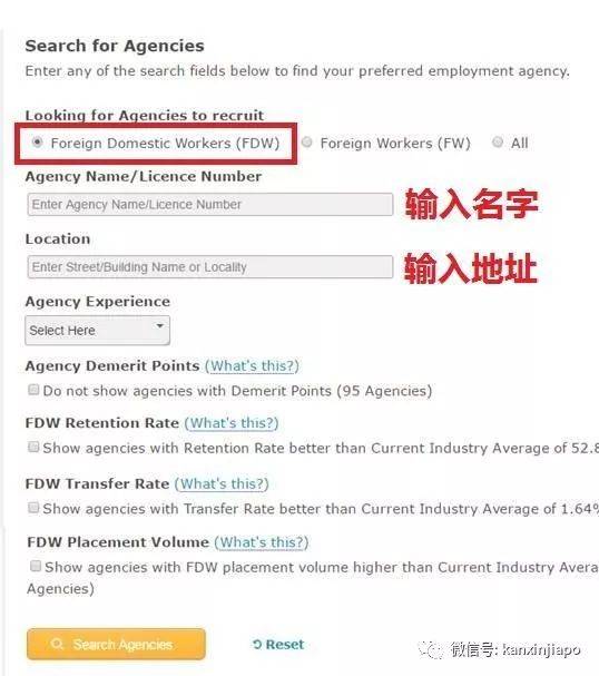 网页界面简单明了,先要选择红框里的FDW以确保选的都是女佣中介。然后就可以输入中介的名字或者你家附近的地址来看有哪些中介可以拜访。屏幕显示的中介信息如下,有几个指标需要注意。