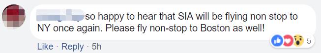 (很高兴听到新航会再次直飞纽约,可不可以也直飞到波士顿)