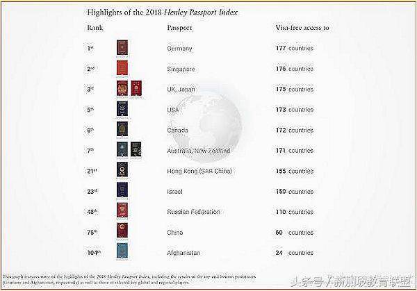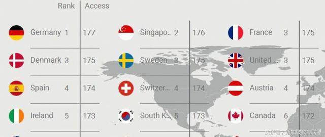 在此次的排行榜中,德国护照再度蝉联榜,第五年位列第一,享有免签证进入177个国家和地区的资格;新加坡位列第二,可以免签进入176个国家和地区。