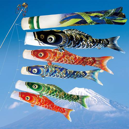 这一天日本家家户户都会用纸或布做成色彩鲜艳、形状像鲤鱼的彩带,