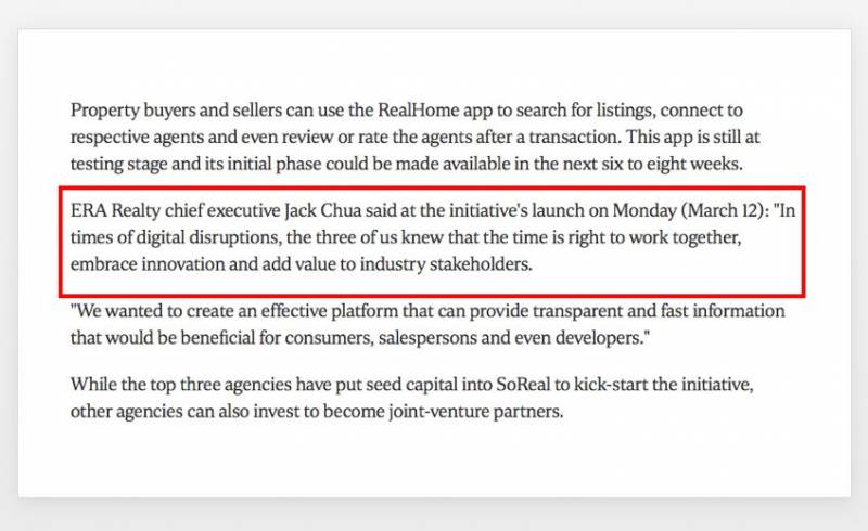 由新加坡三大房地产公司联合推出:昨天新推出的电子平台SOREAL,便是新加坡本地三大房地产公司ERA、Huttons Asia和博纳(PropNex)过去两年的合作结晶。这个平台包含分别为新加坡房屋经纪和买卖双方打造的RealAgent和RealHome手机应用,以及名为SOREAL Prop的网站,提供即时的房产交易信息、数据分析和交易服务。