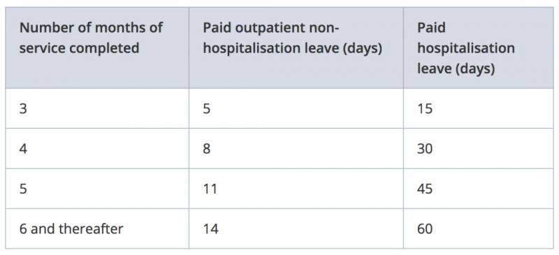 有权享受带薪病假的天数取决于你的工作时间,门诊非住院假期最多14天,住院假期60天。