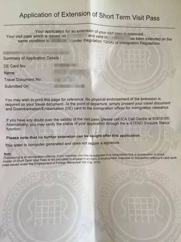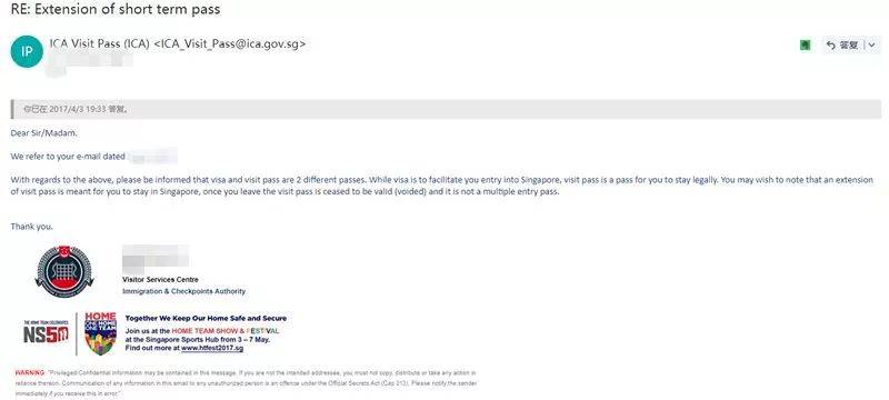 广告“Visa和Visit Pass是两种不一样的概念。Visa是使得你能够入境新加坡的,Visit Pass是你能够合法逗留的通行证。希望你可以注意到,延期的逗留通行证意味着你可以逗留新加坡,一旦离开了就不再有效(失效),并不是多次入境的通行证。”