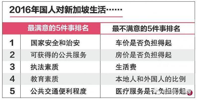 根据调查,新加坡人对在新加坡生活最不满意的五件事顺序分别为车价、房价、生活费、本地人和外国人的比例,以及是否负担得起医疗费用。