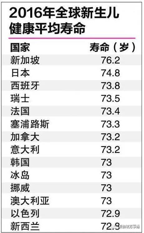 别看新加坡人越来越不快乐,但是新加坡人越来越长寿了!世界卫生组织2016年数据显示,新加坡新生儿的预计健康寿命排名世界第一,达到76.2岁。