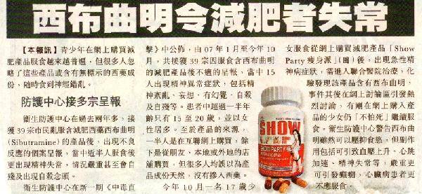 该局发表文告说,这两款瘦身产品含有强效的西药成分,包括药物西布曲明(Sibutramine)。这是一种作用于中枢神经系统的食欲抑制剂,通常只有通过医生开药单才可以买到。服食含西布曲明成分的产品有增加患心脏病和中风的风险。