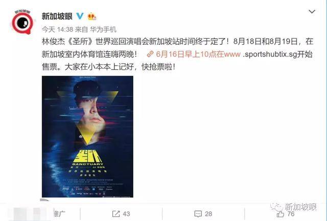 演唱会的主办单位正式放出消息,“林俊杰《圣所》世界巡回演唱会”新加坡站时间和地点确定了,而且连开两场。