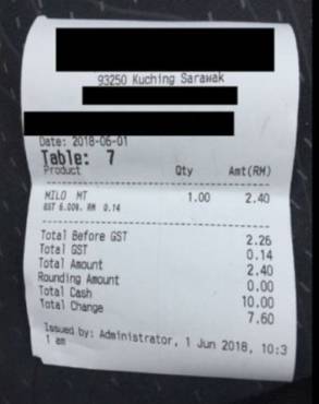 此外,Facebook专页Borneo管理员也上载了一张在古晋某美食中心用餐的收据,揭露商家没遵守消费税归零的政策,更指砂拉越州尚未落实有关政策。
