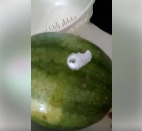 脸书上流传了一段长达15秒的视频。视频中,西瓜不停地冒出白沫,还能听到“嘘嘘”的声音。视频也显示西瓜的名称是“Red Seedless Watermelon”。