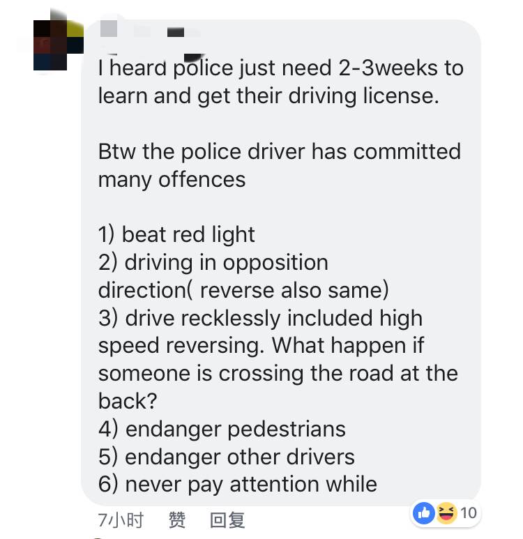 这名网友表示,听说警察只需2-3周便可拿到驾照,视频中的警察所犯的错可不止闯红灯,