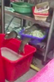 41秒的视频画面显示,地上摆放着一个红色塑料盆,一只老鼠爬到盆边捞食物吃。之后,又出现另外四只老鼠,一只爬上盆边,一只爬上一盆菜上觅食,还有两只在地上乱窜。