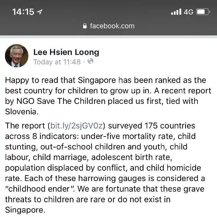 新加坡总理李显龙6月3日发表贴文,对新加坡在国际非政府组织“救助儿童会”(Save The Children)上周三发布的《童年终结数据》报告中,被评为最适合孩童成长的国家表达看法。