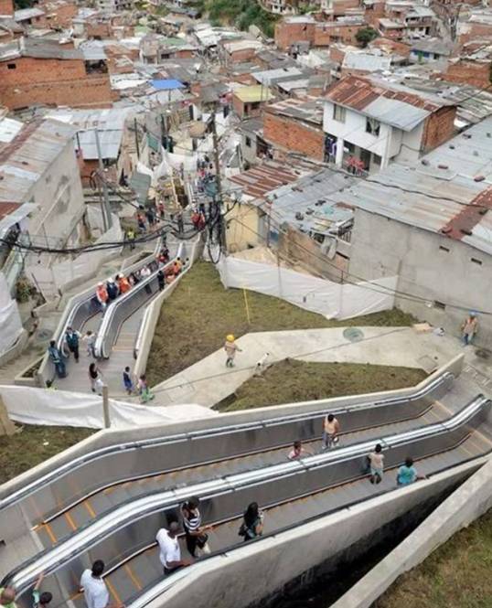 2011年,一个巨大的户外自动扶梯被建立在了哥伦比亚第二大城市最贫困的地区之一。1.2万人世代都生活在麦德林公社13(这个地方位于山坡上),人们出行极为不便,因为在这里人们要攀爬的高度相当于28层楼那么高。