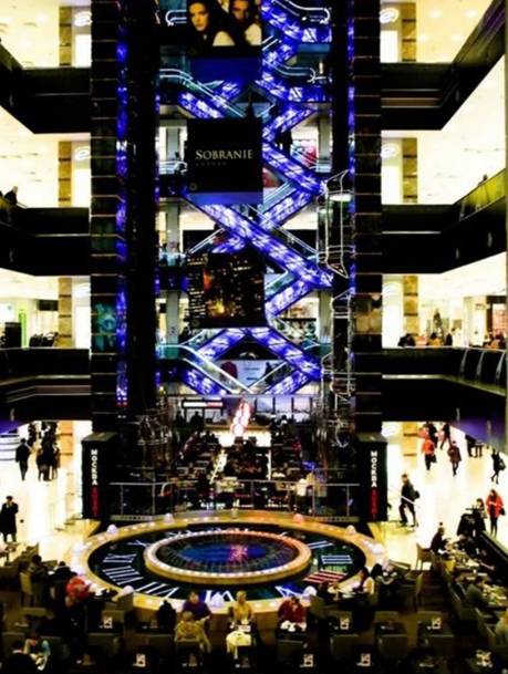 俄罗斯莫斯科Evropeisky商场的自动扶梯会发光。这种交叉式的电梯设计在大多数商场都会使用,这样能最大限度地节省空间。