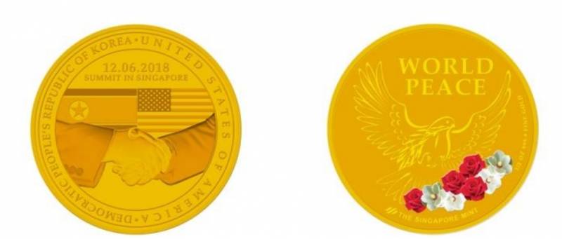 纪念章正面刻上美朝首脑握手的图案,左右两旁分别印有朝鲜和美国国旗,另外印有“新加坡峰会”(Summit in Singapore)的字样和特金会举行的日期,即2018年6月12日。