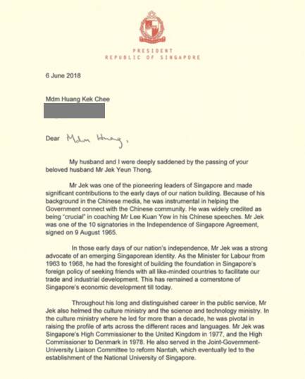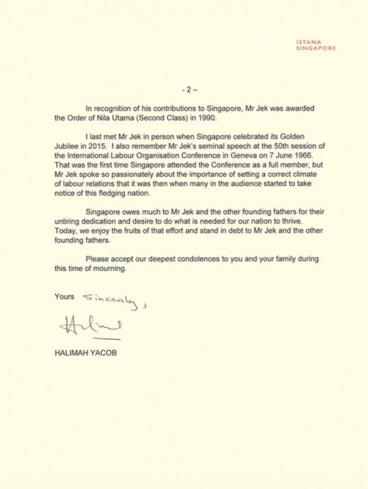 Mr Jek was one of our pioneering leaders and made significant contributions to the early days of our nation building. For almost two decades, he helmed various ministries in important areas such as labour and culture. Many of his initiatives, such as the focus on the correct climate of labour relations, laid the foundation of many of our national policies today.