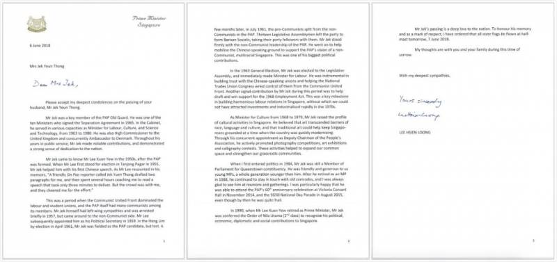 信中,李显龙对易先生一生当中对新加坡做出的贡献表示赞扬。