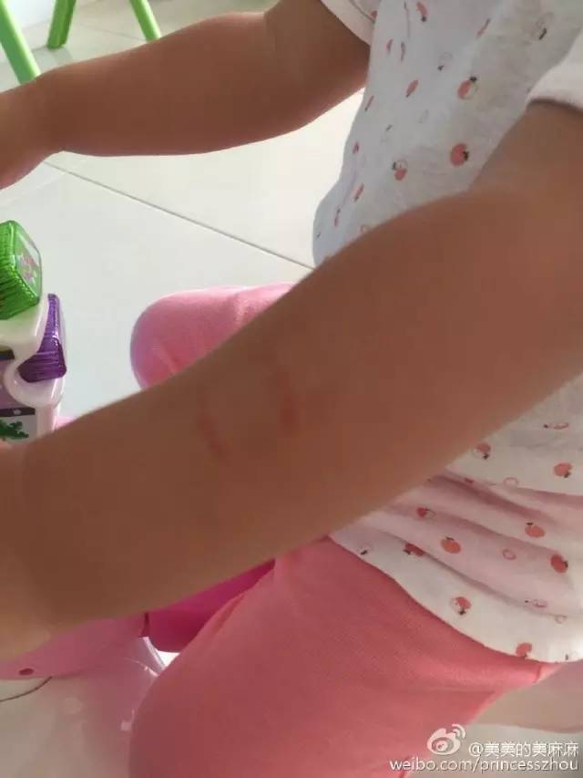 一个叫@美美的美麻麻 的网友在微博上晒出了自己女儿的照片,说近三个月来,发现从幼儿园回来的孩子身上有伤痕和红印。提醒大家不要去这家幼儿园。引起了许多网友的关注。