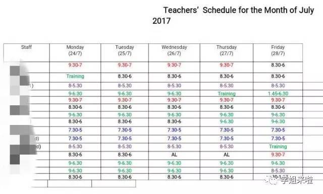 平时的上班是周一到周五,9个小时在校时间,周六半天轮值(一个月一次)。通常学校的营业时间是早上7点到晚上7点,老师们采用轮班制,保证学校全天候正常运转。