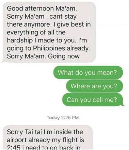 下午2时许,女佣突然发了一则简讯给耿海玉,说自己就要登机。“她在简讯里说自己做到好累,必须回菲律宾,还一直跟我道歉,当时我就觉得不妙了。”