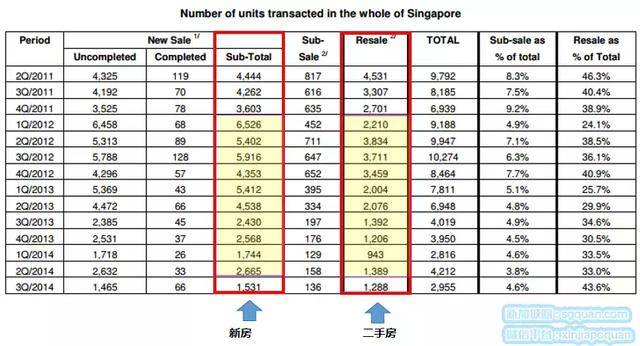 以上的表格,就是新加坡URA城市发展局热腾腾刚刚出炉的,新加坡到2014年第三季度为止,每季度的公寓交易总量。表格统计了新房和二手房各自的销售数量。红色框中的数字,就是新房和二手房的按季度数字。不难看出,绝大多数季度,新房的销售数量,都要大于二手房的转手数量。在有些季度(黄色标注部分),新房的销量是二手房的两到三倍。