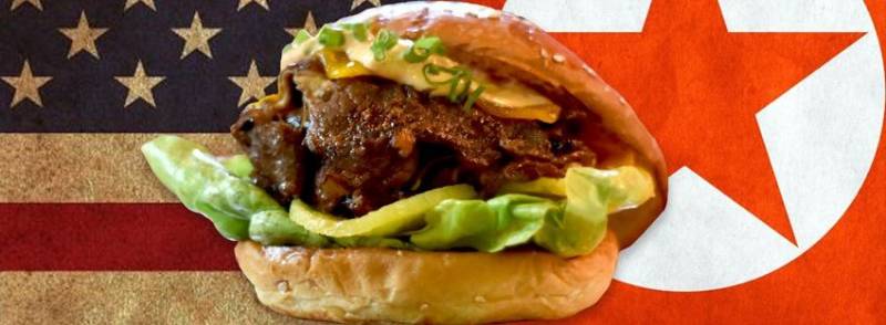 这个汉堡厉害了,把两个国家合二为一,一半是美式牛肉饼加上培根酱和烧烤酱,另一半是韩式烤牛肉加上焦糖洋葱和奶油蒜酱。长达多年的美朝矛盾,被这一个汉堡解决了。