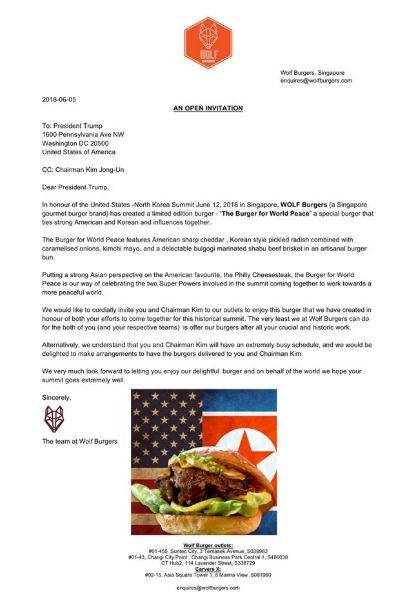 店家“作”起来也是很大(给)胆(力)啊——他们特地发了一封邀请函给特朗普和金正恩,邀请他们来品尝这个汉堡。