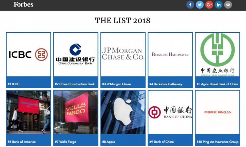 根据福布斯杂志,中国工商银行是连续第六年高居榜首。10强当中除了中国四大银行,中国平安保险今年第一次入榜。