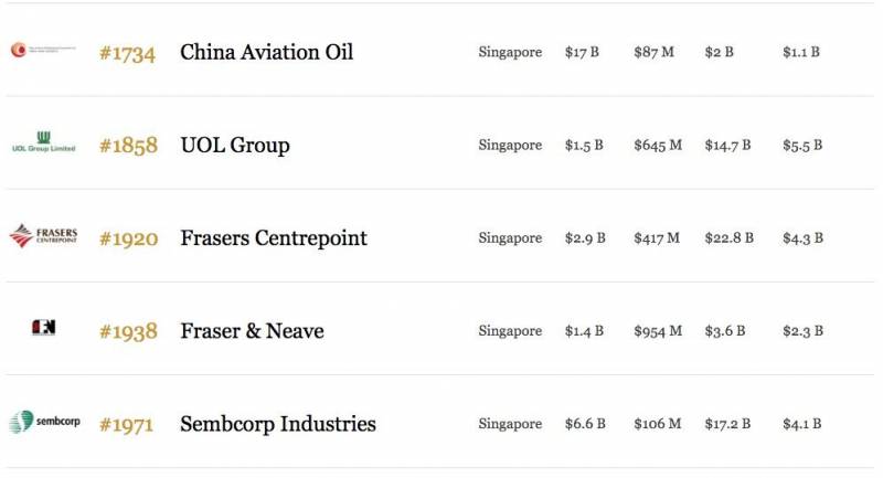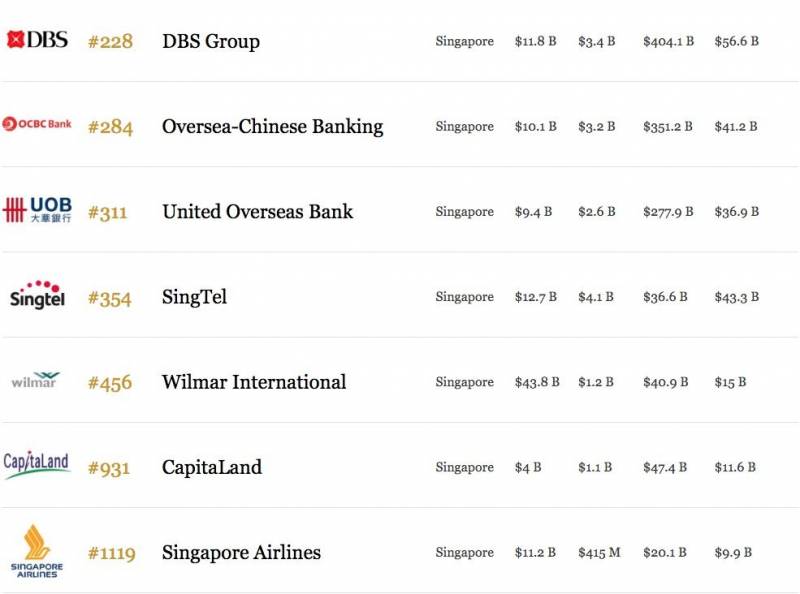 根据新加坡8频道新闻,联合早报,以及海峡时报报道,今年有15家新加坡公司入选福布斯杂志(Forbes)年度全球2000企业排行榜,包括星展集团、华侨银行、大华银行、新电信和丰益国际。