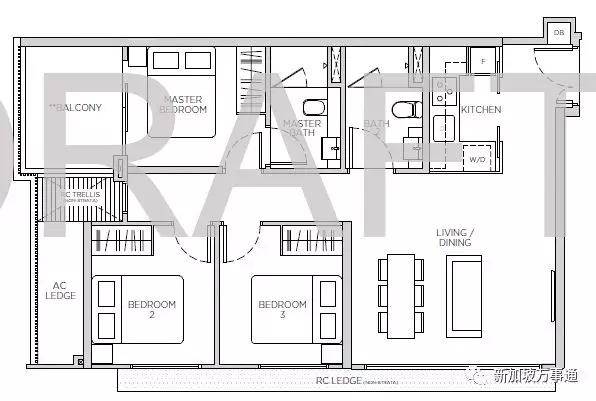三室一厅两卫户型,面积84平米(904平方尺),2楼定价159万1千新币。3楼160万1千新币。