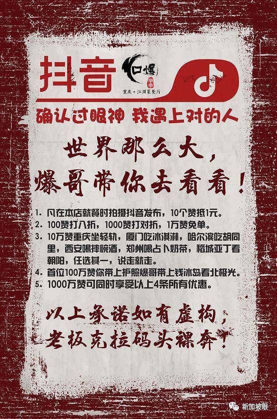 如果你是抖音发烧友,到店发抖音,就有机会免单、重庆坐轻轨、冰岛看极光…还做店老板… 若有虚假,老板就要裸奔啦,详情研究下面海报哦。
