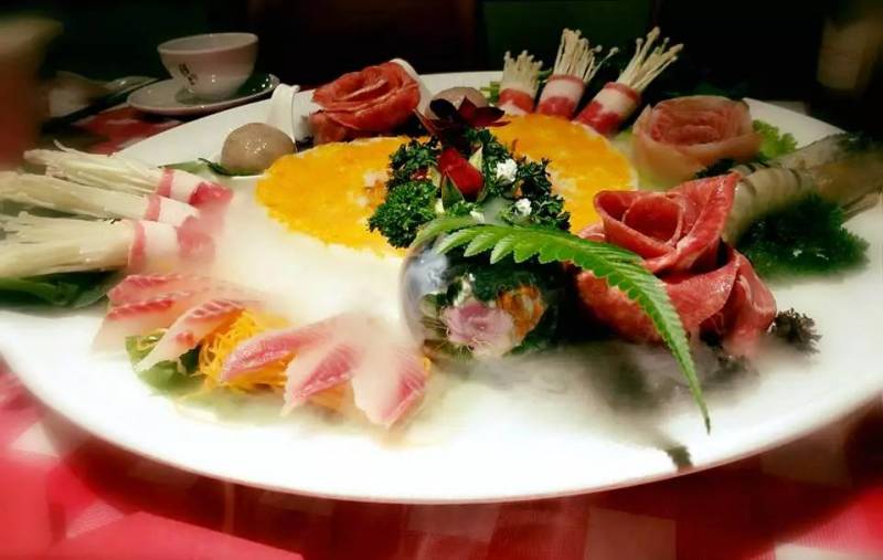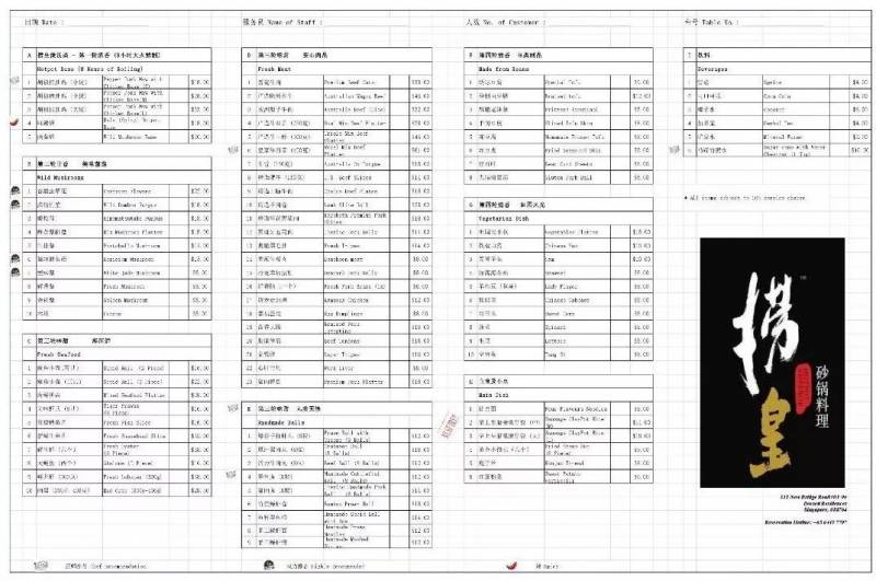 捞皇主打粤式养生汤——猪肚鸡汤。用新鲜猪肚,熬出乳白色,再把鸡放入锅里,更增鲜味。在广东用走地鸡,在新加坡则就地取材,用了甘榜鸡。用胡椒及各种香料和药材,小火慢炖8个钟头以上。