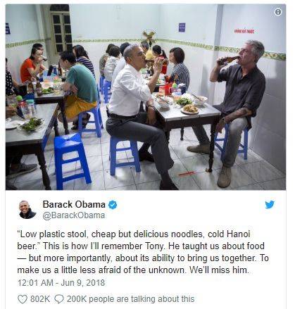 安东尼入得了厨房,也上得了荧幕,还曾和美国前总统奥巴马在越南偶遇,一起下馆子吃饭饭~ 今天奥巴马也有在推特上发出当年的图片,以示怀念...