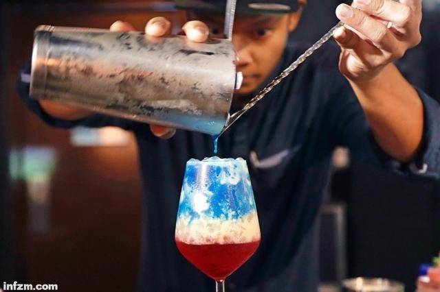 当地时间2018年6月7日,新加坡,狮城一处美食酒吧借6月12日即将到来的“特金会”之风,推出特制鸡尾酒。蓝色的酒叫“特朗普”(Trump)、红色的酒叫“金”(Kim)。