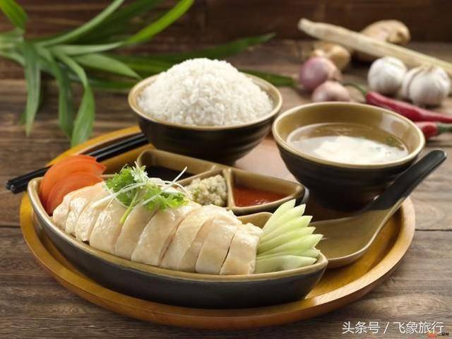 海南鸡饭是新加坡早期移民的菜色。做法简单:鲜嫩多汁的白斩鸡搭配油光黄澄香鸡饭,配生抽或者老抽和特制辣椒酱及姜蓉。烹调海南鸡饭的每一部分都必须一丝不苟,方能做出美味无比的佳肴,是新加坡美食之选。