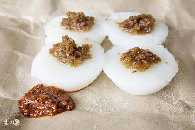 水粿是一种非常地道的新加坡小吃,用白米磨成粉浆后倒入一个半圆形的模具,再放入蒸笼蒸熟成型,吃的时候配上蒜茸和菜脯,再淋上特制的酱料即可。