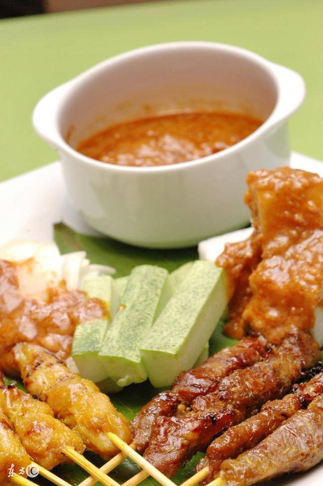 这种食品调制沙爹酱是关键。沙爹酱用椰浆、花生酱和虾肉调制而成(沙爹酱也有很多不同的调制方法)。再将特制的牛肉、鸡肉和羊肉用竹签串好,放在炭火上烧烤(和我们街边烤肉串差不多?),吃的时候蘸上沙爹酱就行了。